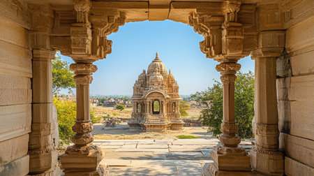 Jain pilgrimage site viewed through an ancient temple archway, no people, clear sky, ample copy space