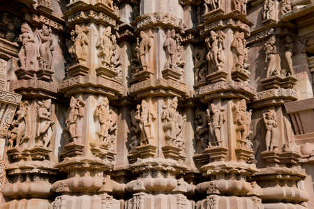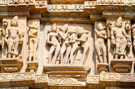 Sex poses from the kamasutra, erotic close - up of intricate carved scenes on the walls of Hindu temples in the Western group of Khajuraho, India.