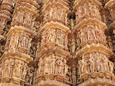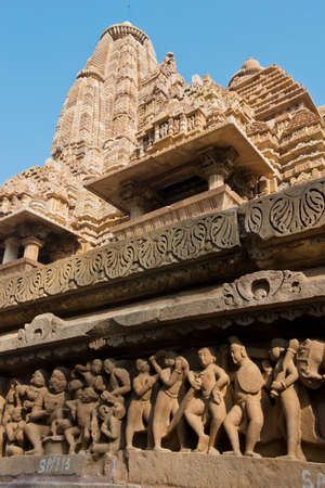 Stone carved temple with erotic sculptures in Khajuraho, Madhya Pradesh, India