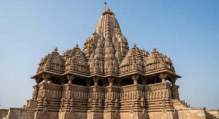 Captivating view of an ancient temple showcasing detailed stone carvings and intricate designs under a clear blue sky, reflecting cultural heritage and spirituality.