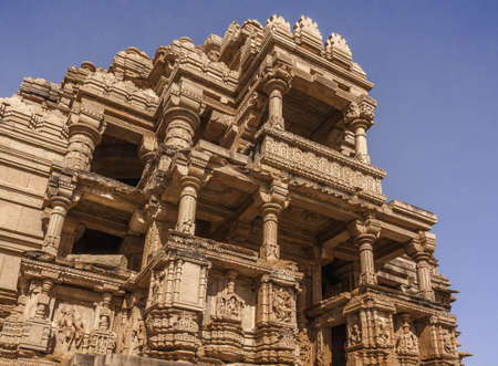 Exterior facades roofs of Jain Ranakpur Temple stone carve, Udaipur, Rajasthan, India on blue sky