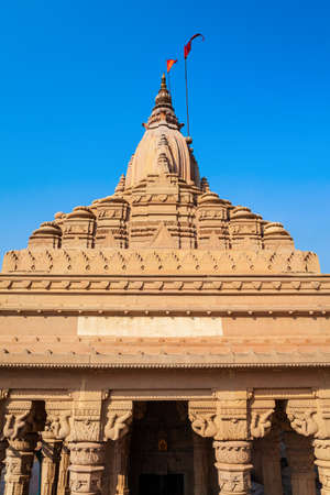 Nice carvings on goddess Ekveera temple with flag on clear blue sky background. Can be used as wallpaper background.
