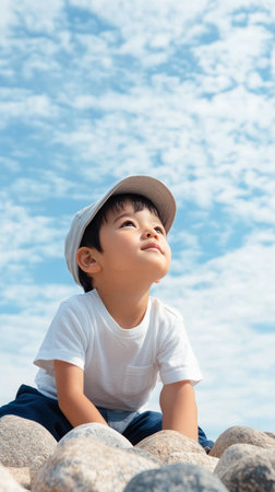 A young boy is lounging comfortably on a stone wall with a peaceful expression. He enjoys the warmth of the sun and the gentle breeze while gazing upwards at the clouds.