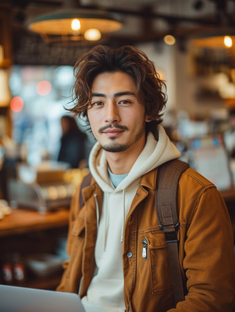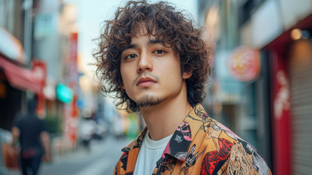 Adult Chinese Man with Brown Curly Hair photorealistic illustration.