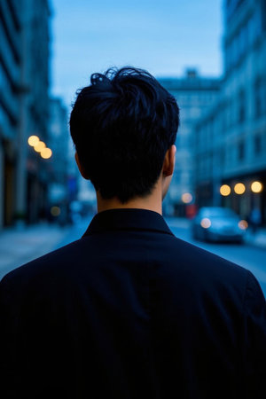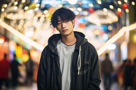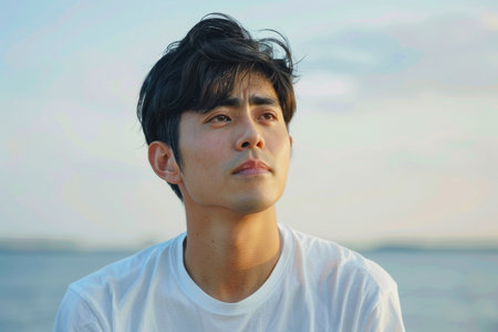 Young East Asian man looking thoughtfully into the distance. Outdoor portrait with natural background