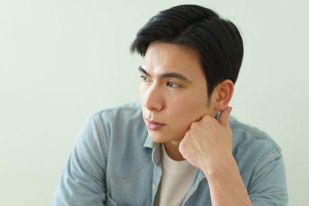 A young Asian man with short hair sits in a relaxed manner, resting his chin on his hand while looking thoughtfully to the side against a light-colored wall, suggesting deep reflection.