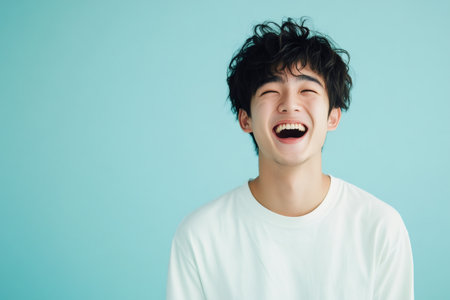 Young Asian man laughing aloud with eyes closed in joy. Expressing cheerful, carefree emotion and positivity on a turquoise background