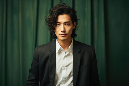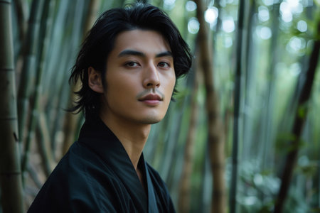 Portrait of young Asian man with dark long hair in traditional clothes looking at camera