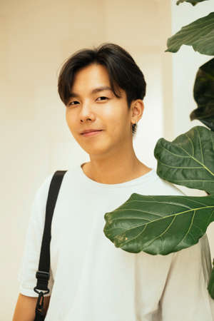 Medium shot of teenage guy in white t-shirt standing next to the tree with green leaf at the white wall then smile.