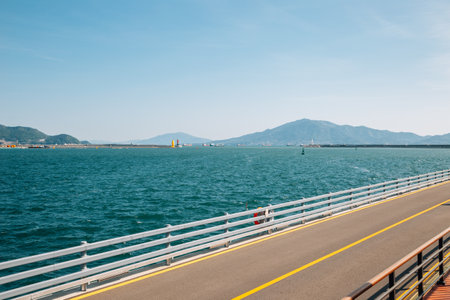 View of the Kanmon Straits between Fukuoka and Yamaguchi Prefectures and the view of the Kanmon Bridge connecting the straits and the blue sky