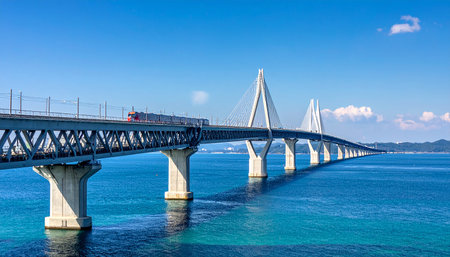 Aerial view of a grand coastal bridge with cars and multiple roadways amidst vibrant blue waters