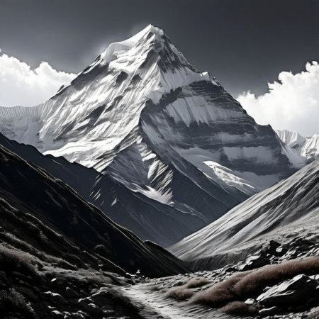 Serene black, white painting capturing majestic Nepal mountains, lush trees in harmonious contrast. Logo design for outdoor adventure travel agency, nature themed website, social media banner, print