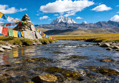 Tibetan prayer flags on the banks of a mountain river in Tibet