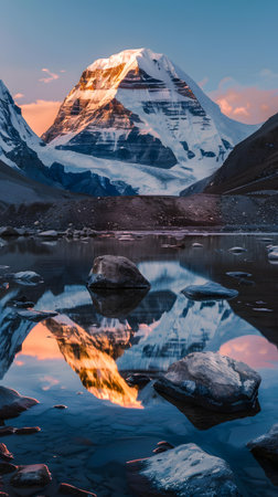 Majestic Mountain Peak Reflecting in Calm Lake at Sunset