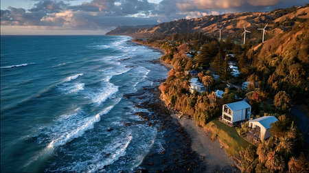 Stunning aerial view capturing a rugged coastline with waves crashing against rocks, houses nestled among trees, and wind turbines generating clean energy at sunset