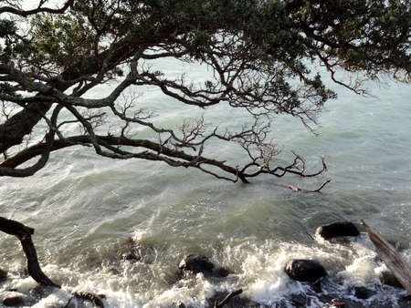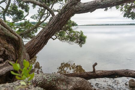 Mangawhai estuary view through branches pohutukawa tree on dull overcast morning