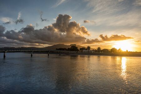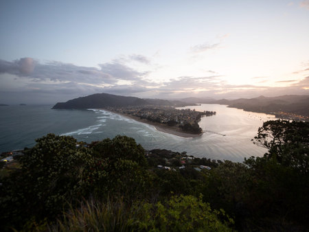 Sun rises over ocean and coastal beaches of Bay of Plenty viewed from Mount Maunganui.