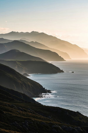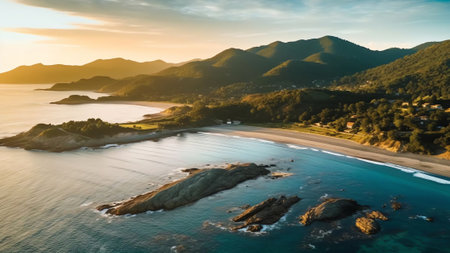 Aerial beautiful shot of a seashore with hills on the background at sunset