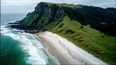 Aerial view of a rugged coastline featuring lush green hills meeting a sandy beach with gentle waves.