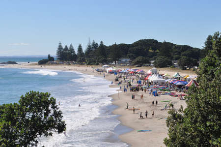 A crowd of people enjoys the surf at Tauranga beach, New Zealand