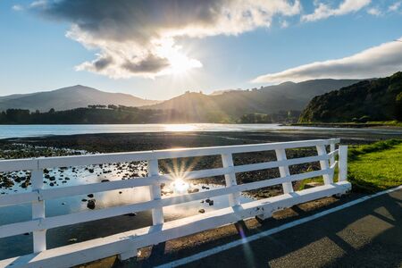 A little stream flowing into a fjord in the Banks Peninsula, New Zealand. The sun is reflecting in the ocean, creating an interesting lighting effect combined with the white fence.