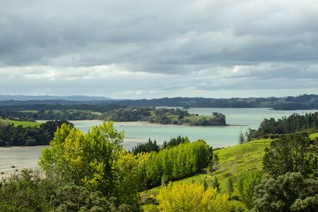 Looking from a high vantage point over Hokianga Harbour and Opononi settlement. Northland, New Zealand