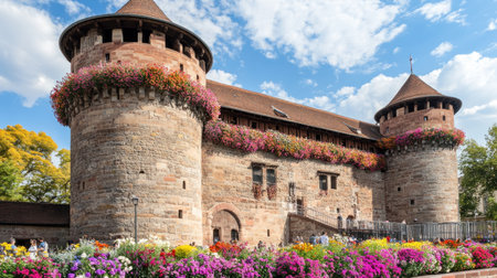 Photo of the outdoor flower show in the Albrecht Tower on Massena Street, Strasbourg, France. The walls and roof of an old stone building are decorated with colorful flowers, with a blue sky in the background. --chaos 30 --ar 16:9 --v 6.1 Job ID: fcf3db80-4126-4bad-b7eb-6706b31aa6d7