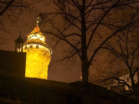 Nurenberg, Germany - December 10, 2014: Night view of ancient Tower of castle in the historic center illuminated at Christmas time.