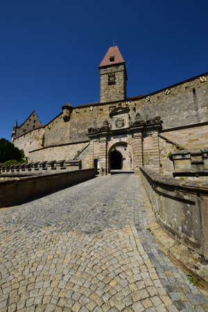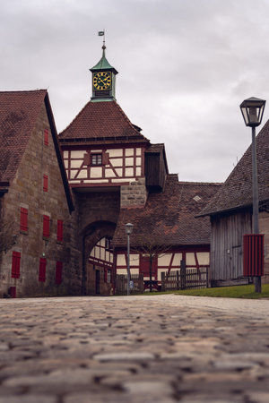Inside of medieval castle Cadolzburg in Franconia, Bavaria. Half-timbered tower with a clock.