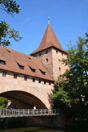 Scenic view of Henkerhaus Museum, Wasserturm, and both medieval bridges Henkersteg and the second wooden bridge in Nuremberg, Bavaria, overlooking the Pegnitz River.