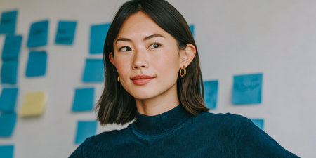 A woman stands confidently in a workspace with blue sticky notes in the background. She is smiling slightly while wearing simple clothes and earrings. Light fills the room.