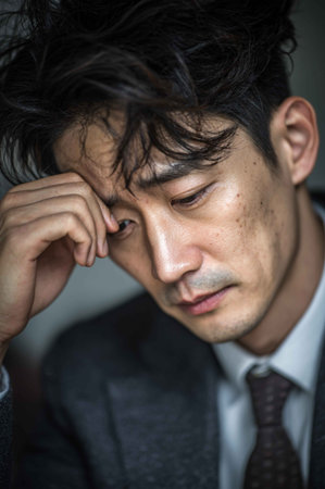 photo of a handsome Korean man in his late 30s, wearing a business suit, messy hair, looking tired and anxious, realistic skin texture