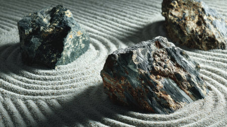 A calming scene featuring rugged rocks placed on smooth sand, creating gentle rippling patterns, ideal for conveying tranquility and mindfulness in visual art.