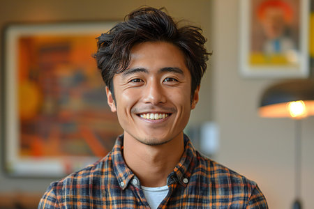 Portrait of a young asian man smiling at the camera.