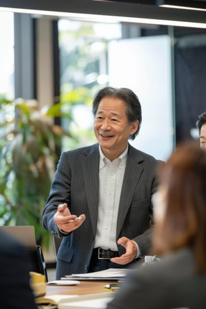 a Japanese business coach conducting a leadership training session in a modern office