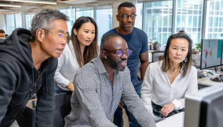 Focused businesspeople collaborating, analyzing data on a computer screen in a bright, modern office environment