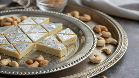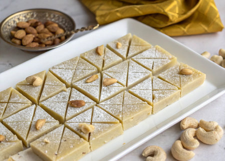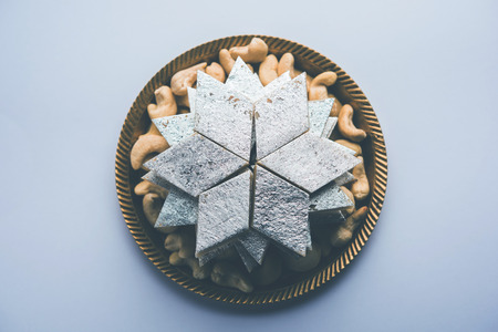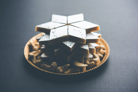 Kaju Katli is a Diamond shape Indian sweet made using cashew sugar and mava, served in a plate or bowl over moody background. selective focus