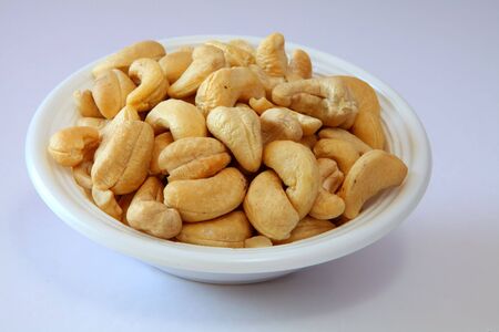 Roasted cashew nuts in a white bowl on white background.