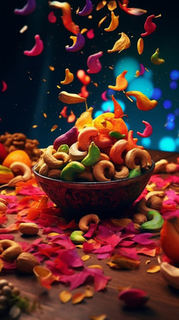 Mix of nuts and fruits in a bowl with colorful confetti.
