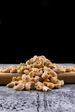 Salted cashew nuts on a black background. Healthy snack