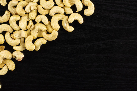 Lot of whole raw cashew nut upper corner flatlay on black wood