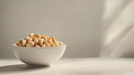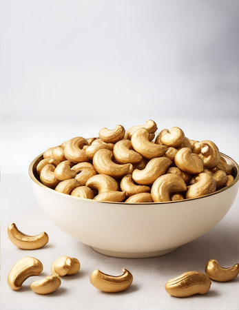 Clean, minimalist image of roasted salted cashew nuts in a white bowl on light background