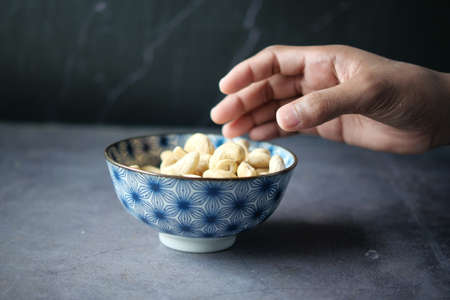hand pick cashew nut from a bowl on table
