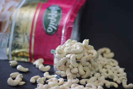 Mumbai, Maharashtra, India, April 24 2021: Ready to eat whole cashew nuts in a colourful packaging by Happilo from India