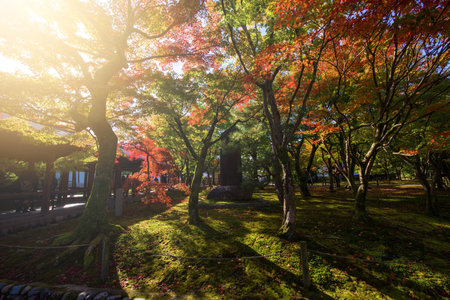 stone inscription and fall garden against sunlight at Tofuku-ji temple, Kyoto, Japan