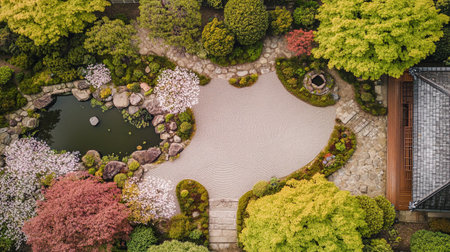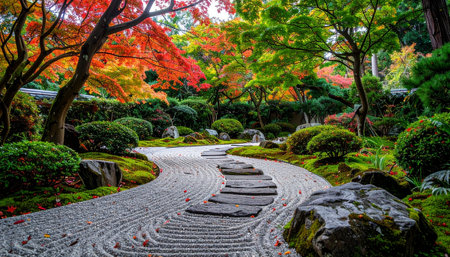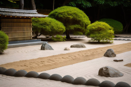 Experience the tranquility of a Zen garden featuring arranged stones and raked sand, inviting mindfulness and serenity amidst nature's beauty and artistry.
