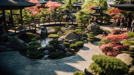 Tranquil Japanese garden in bustling metropolis raked gravel paths and koi ponds.
