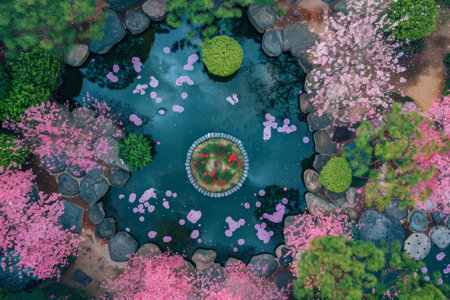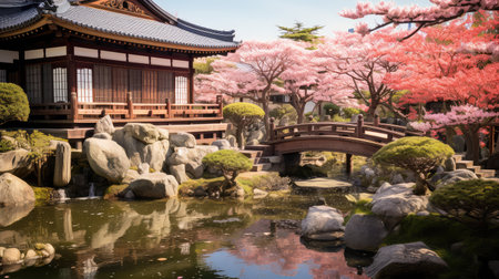 A Japanese garden with a pond and cherry blossoms. The pond is surrounded by rocks and the cherry blossoms are in full bloom. The garden has a peaceful and serene atmosphere