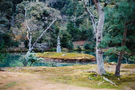 Lake and stone pagoda in Kinkakuji (Golden Pavilion), Kyoto, Japan
