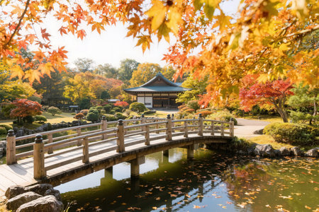 Japanese garden in autumn season with colorful maple leaves and wooden pavilion